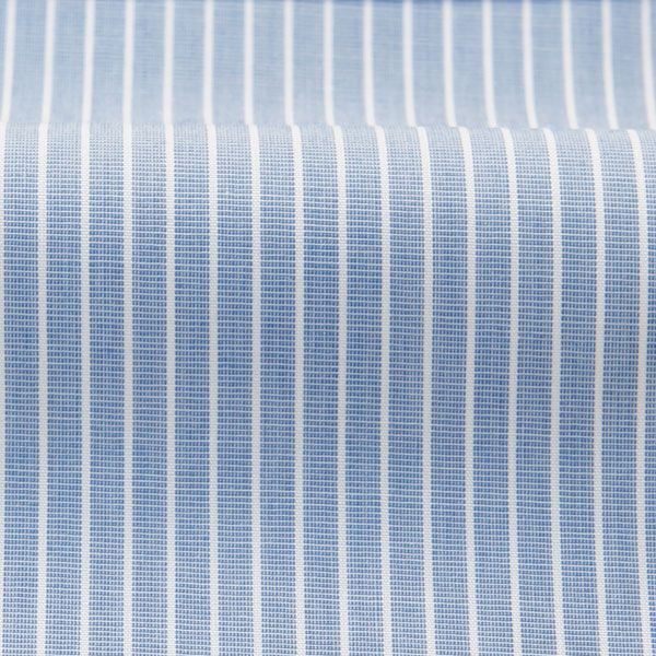 Tissu chemise 100% coton compact non iron 115 gr bleu rayure blanche, doux et léger, facile à repasser, couleur printanière, peut se porter avec un costume pour un style très chic, ou avec un jeans ou un look décontracté