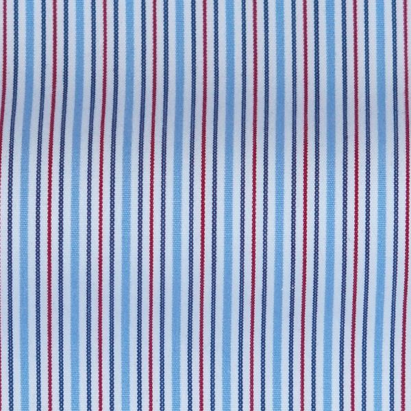 Tissu chemise 100% coton 120/2 125 gr rayures bleus, blanches et rouges, soyeux et raffiné, haut de gamme, idéal en opposition avec un tissu blanc pour le col ou les poignets par exemple, se porte avec un pantalon en toile ou un jeans pour un style chic et classique, existe en chemisette pour l'été.